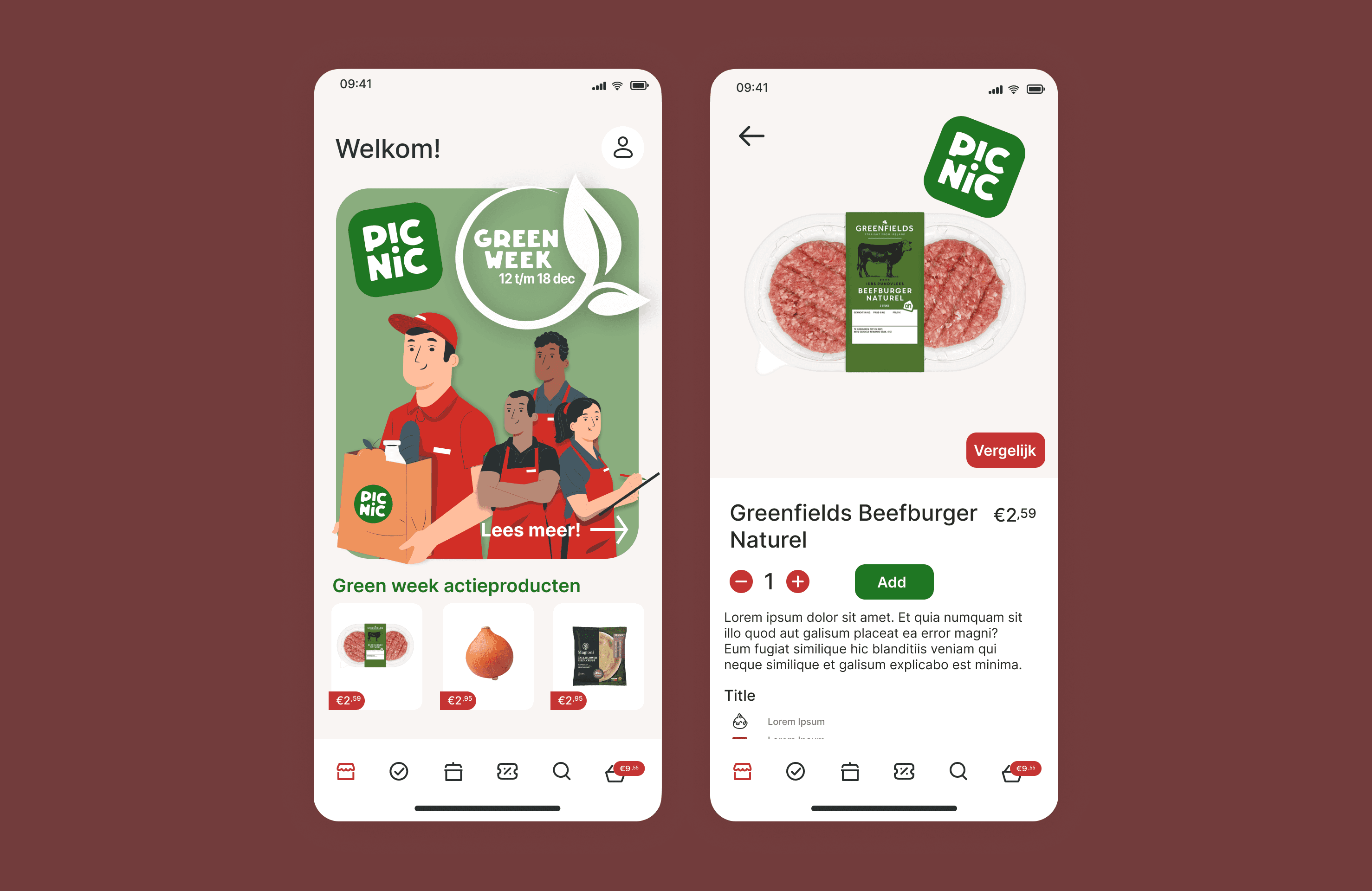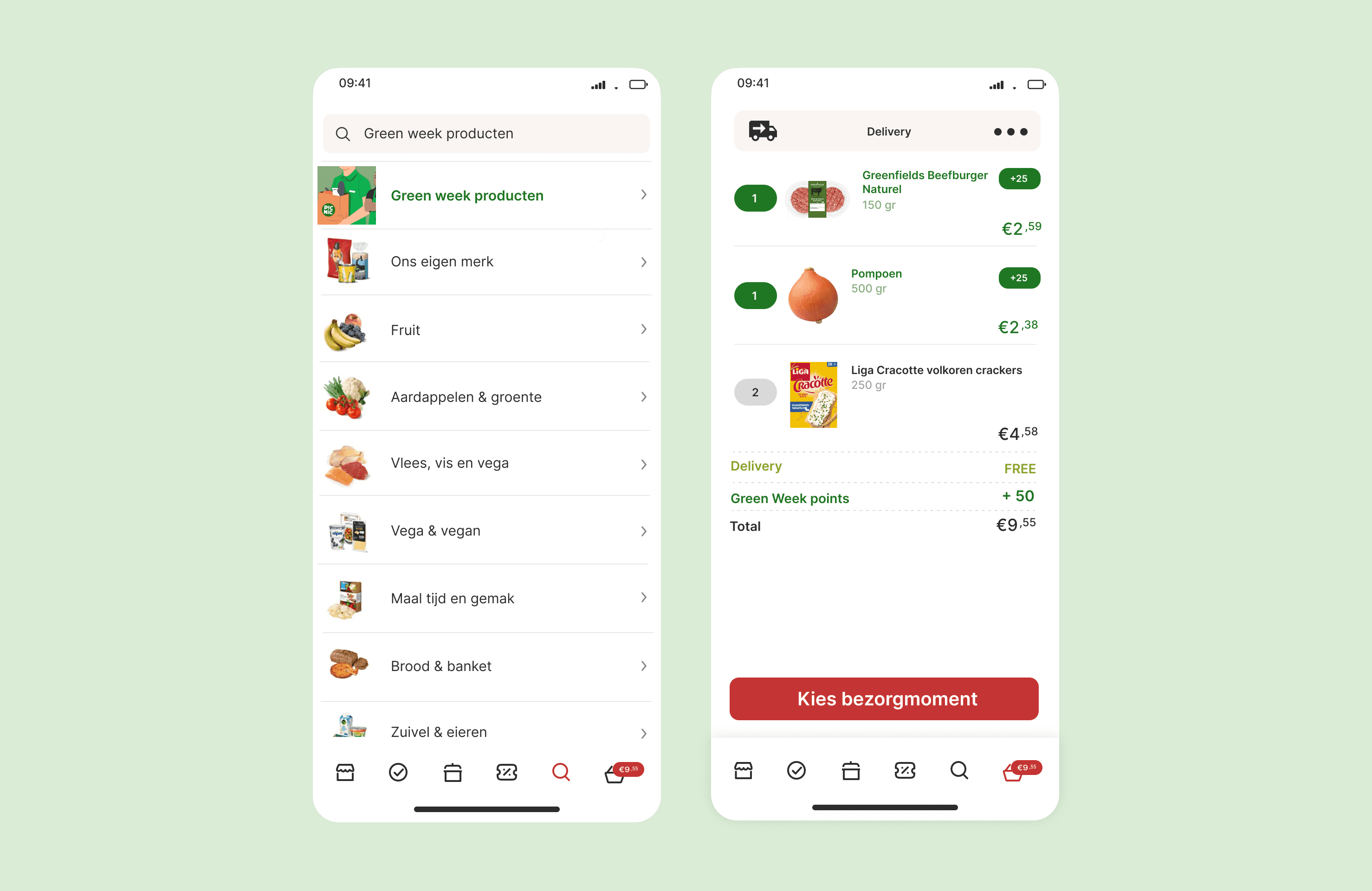 Our final concept is called 'Green Week': a themed week within the Picnic app that promotes sustainable products through a reward-based system. During Green Week, customers earn points by purchasing sustainable items. These points can be redeemed for free Green Week products. To keep the user experience familiar, the app remains largely unchanged. Only new features like an intro screen, points page, and product comparison tool are added temporarily. By keeping the core experience intact, we made it easier for users to adopt sustainable behavior without overwhelming them. The ultimate goal is to raise awareness and encourage long-term behavior change, even after Green Week ends, contributing to a more climate-conscious lifestyle.