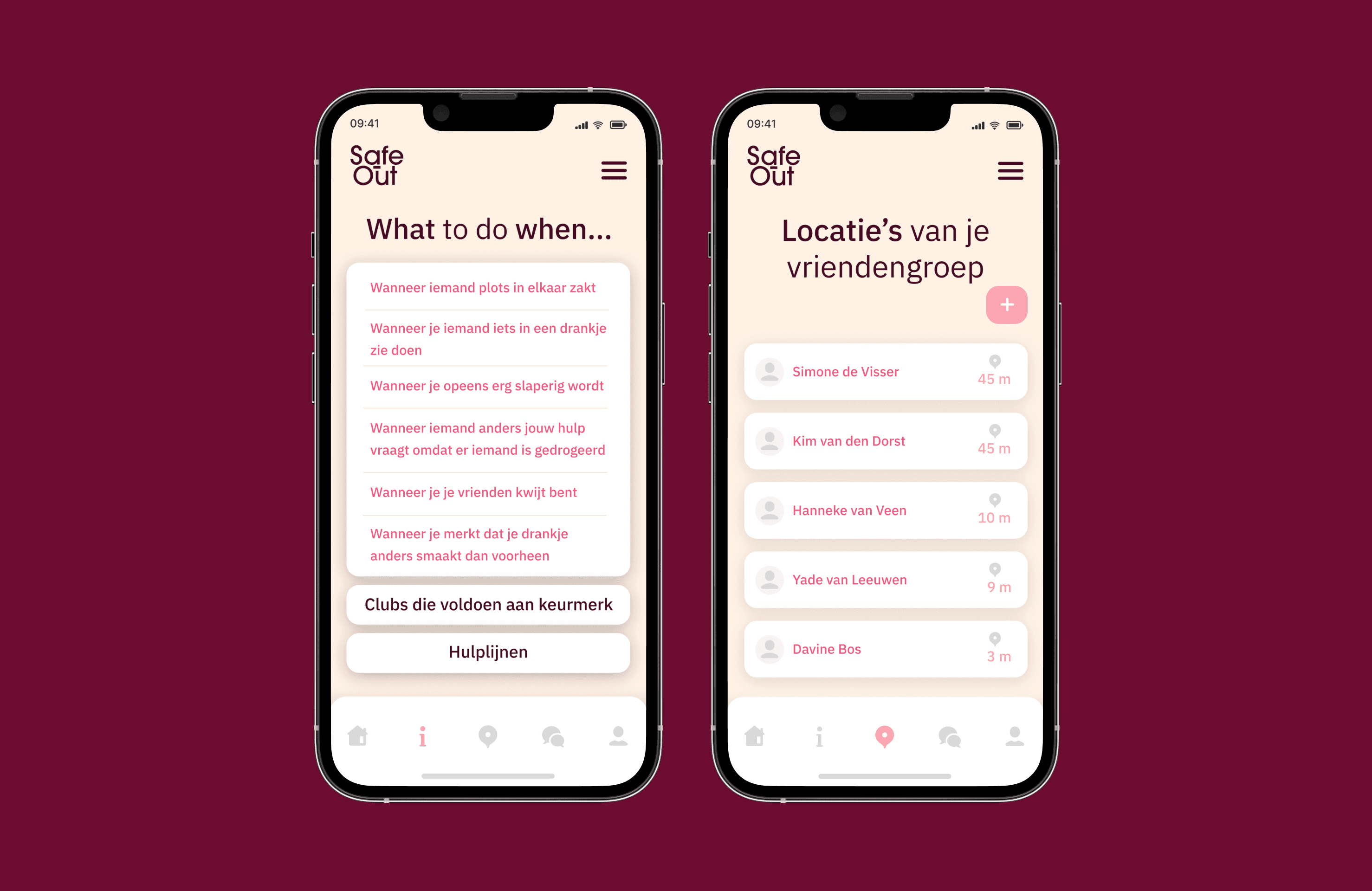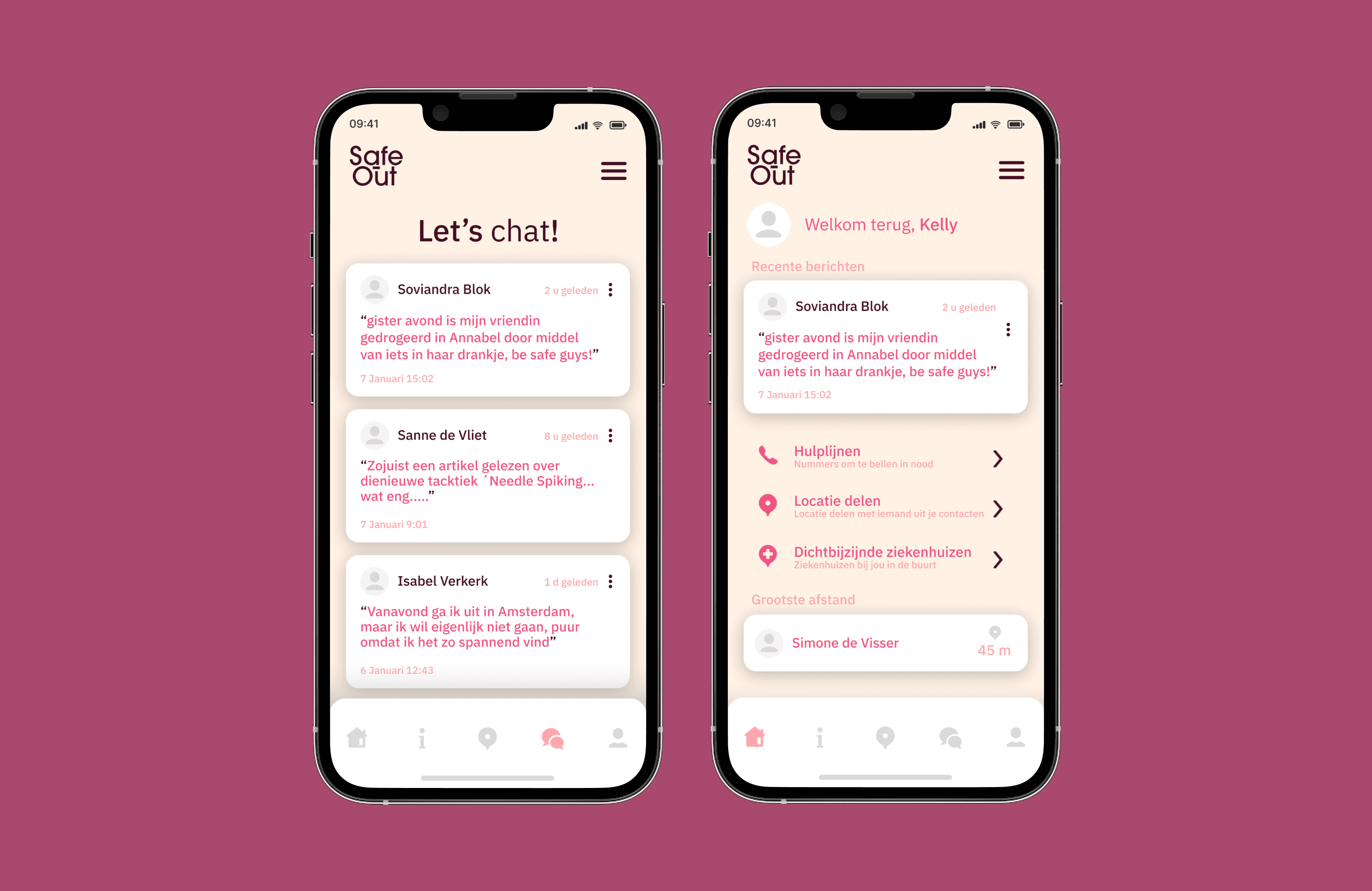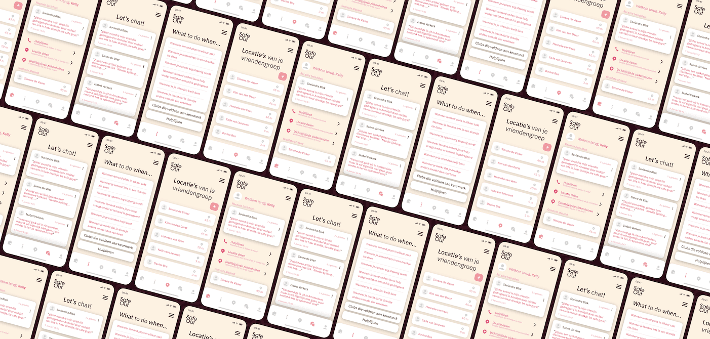 Safe-Out is a digital concept designed to improve the nightlife safety of young women in Rotterdam. By combining real-time location sharing, accessible safety information, and a peer-driven community forum, the app empowers users to look out for each other and make informed choices making going out feel safer, more connected, and more supported.